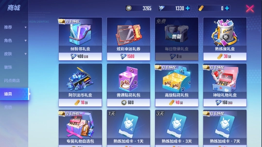 6、道具:可购买的道具有经验书礼盒、炫彩幸运礼券、每日登录礼盒、神秘礼物礼盒、机动团改名卡,大家根据自身需求选择就行。要是想获得珍贵皮肤,炫彩幸运礼券可以优先考虑入手。