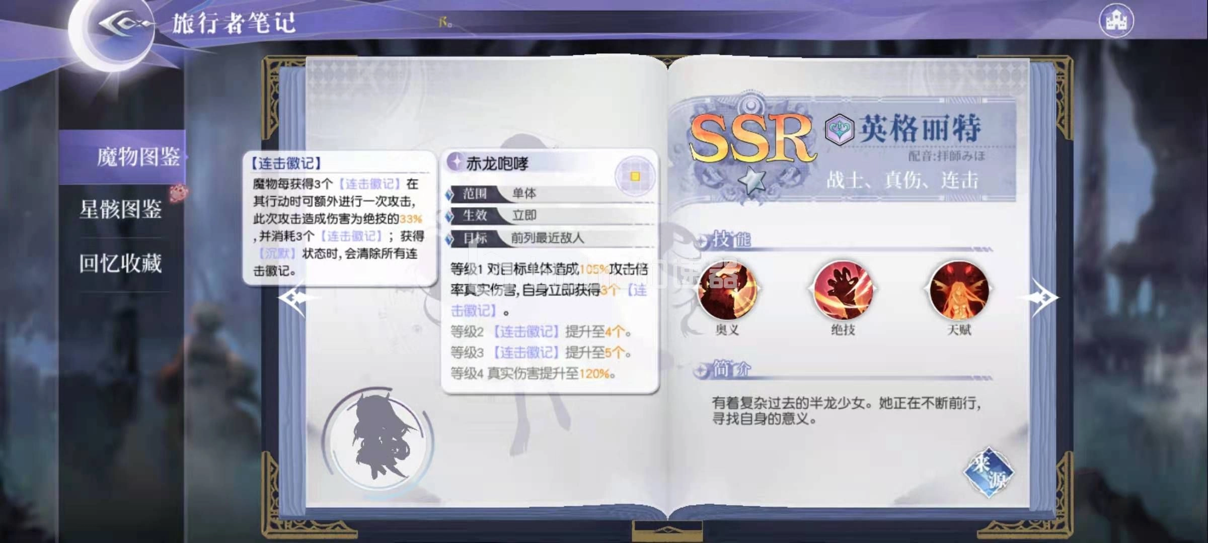 英格丽特的专长在于真实伤害,在月神的迷宫里,真实伤害能够无视对方的所有防御效果,因此它是所有输出类型中伤害最高的。英格丽特的真实伤害主要来源于她的奥义技能赤龙咆哮和绝技崩山爪击。赤龙咆哮不仅能造成高额的单体真实伤害,还能让英格丽特自身获得连击徽记。而连击徽记也是英格丽特重要的输出来源之一,当她积累到三个连击徽记时,每次出手后就会额外进行一次攻击,与此同时,这三个连击徽记也会被消耗清除。