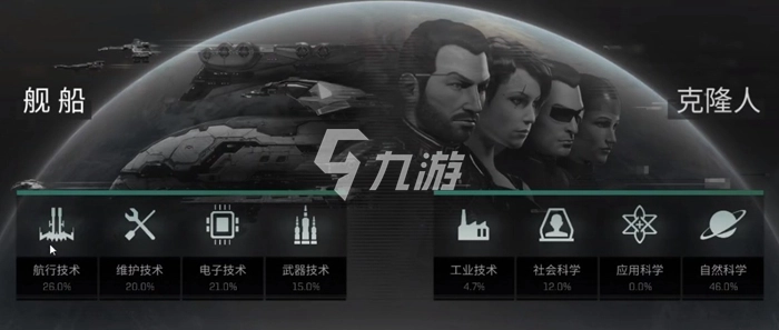 技能分为舰船和克隆人两个大类。舰船类包含航行技术、电子技术、维护技术与武器技术四个小项;克隆人类则涵盖工业技术、应用科学、社会科学和自然科学四个小项。