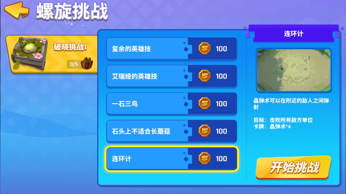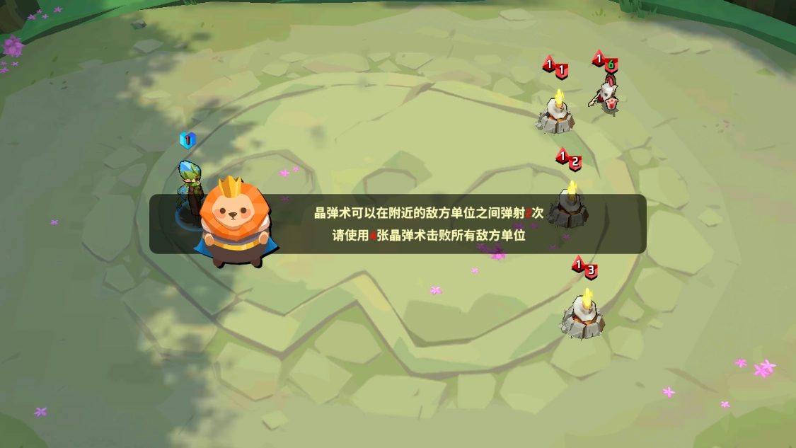 (3)通关思路:法术卡牌“晶弹术”能够在周围的敌方单位间弹射2次,还请使用这张晶弹术来击败所有敌方单位。