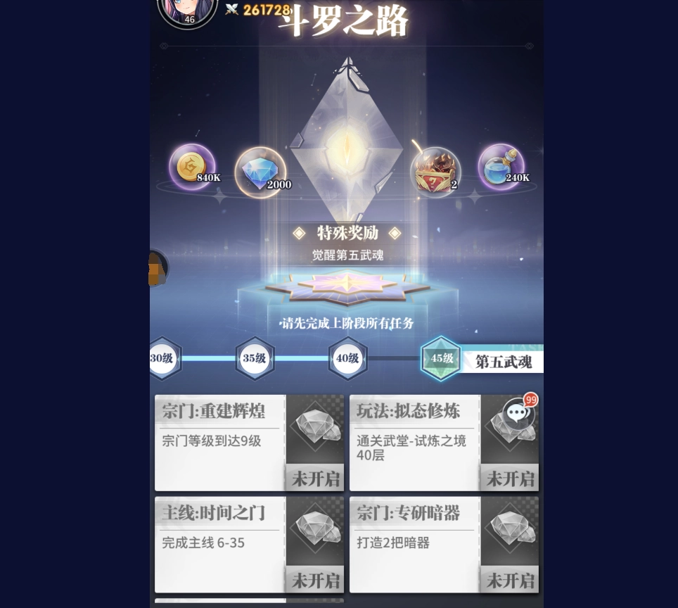 在战斗准备界面中,我们可以进行武魂更换操作,该界面同时支持魂师与武魂的替换。在魂师阵容的左下角,有一个武魂样式的圆形按钮,点击此按钮即可进入武魂替换界面,选择并更换所需的武魂。而武魂的觉醒则需要通过推进斗罗之路来实现,当前游戏内共有五个武魂,只需将斗罗之路提升至45级,就能解锁最后一个武魂。