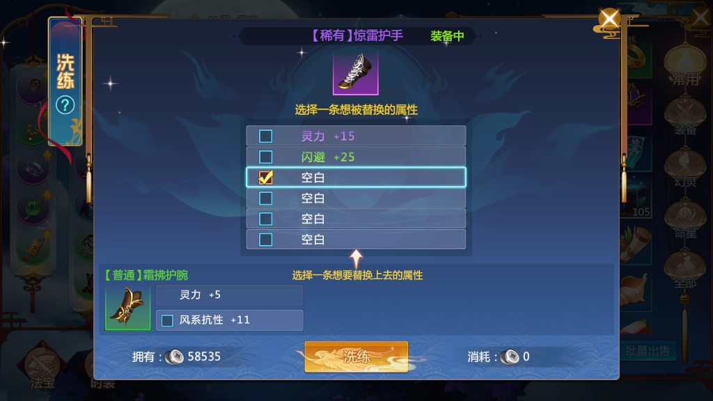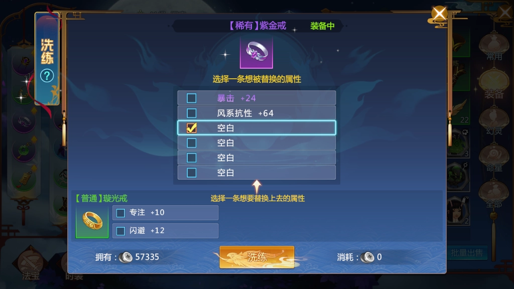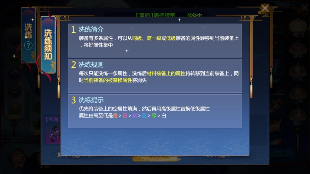 需要注意的是,我们得先点击背包里的装备,再将背包装备的洗练属性转移到身上已穿戴的对应装备上。因此,在进行洗练操作时,务必确保同部位有装备穿戴在身上。