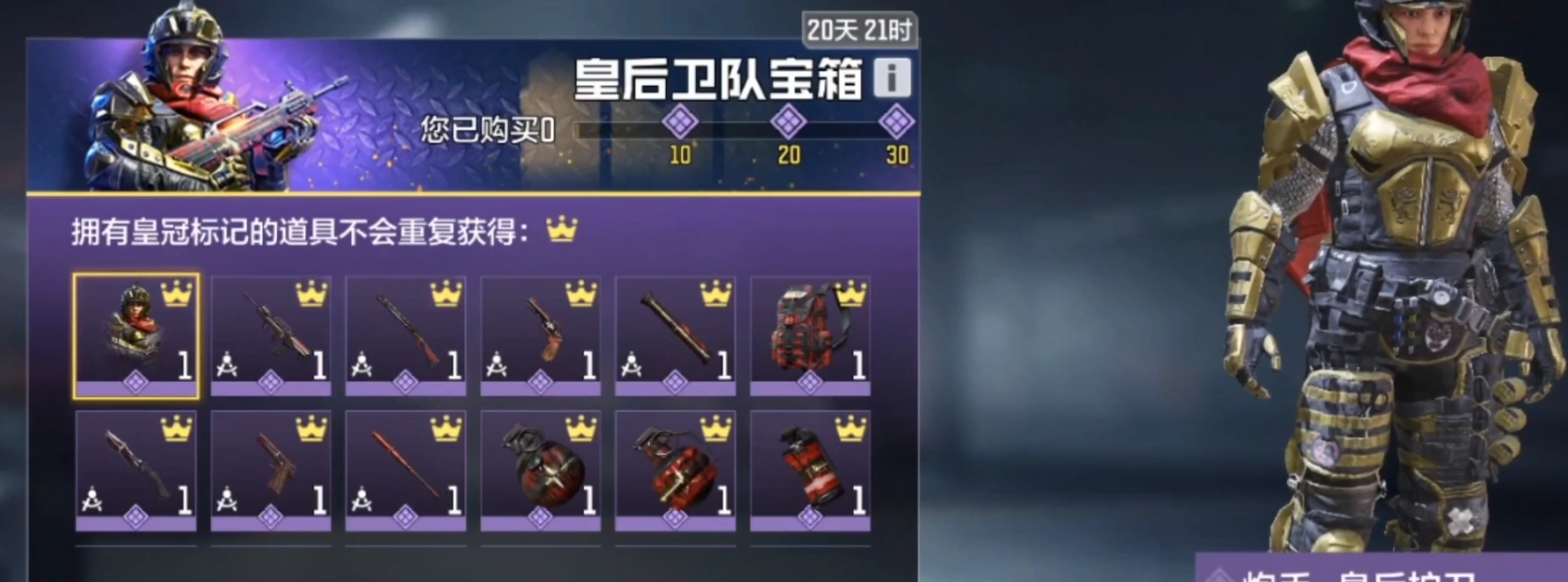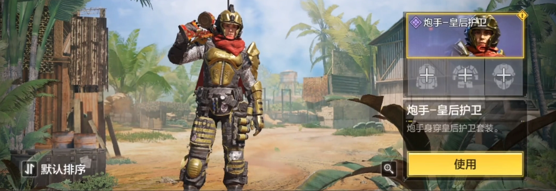 炮手皇后护卫是一款充满战争氛围的皮肤,角色身披黄金战甲,背后飘扬着红色披风,尽显威武霸气。想要获得这款皮肤,玩家需要开启皇后卫队宝箱进行抽取。我当时抽了6次十连抽才拿到手,可见其获取难度不低。对于微氪或零氪玩家来说,除非你运气极好(欧皇附体),否则不太建议轻易尝试抽取这个宝箱。