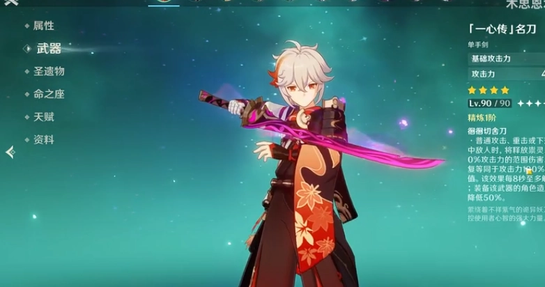 当然啦,虽说这把武器是万叶传说任务的奖励,但它其实不太适配万叶哦。对万叶而言,【元素精通】依旧是最关键的属性,不过要是你的万叶已经满6命了,倒是可以尝试用这把武器~