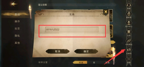其次,新玩家注册账号进入游戏后,点击地图左下角的设置按钮,在右侧界面就能找到“兑换码”选项,进入该界面即可使用兑换码进行兑换。