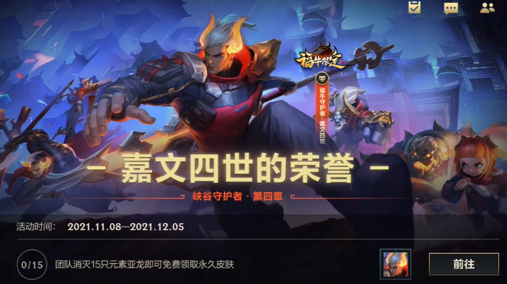 第四个活动是关于嘉文四世的荣誉主题活动。在该活动期间,玩家需完成一系列任务。当前阶段的任务要求是累计团灭并消灭15只元素亚龙,达成后即可免费获取一款永久皮肤。