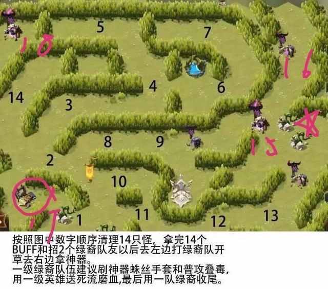 按照图里大数字的顺序清理掉十四只怪物,就能得到十四个增益效果和两名绿裔伙伴,之后前往左侧挑战绿裔队伍,开辟出草地区域去获取装备。