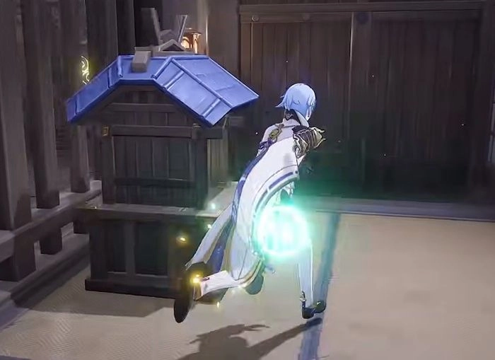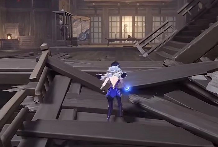房间左边有个符,拿到它后走到木质小柜子旁就能直接触发机关。机关解锁后,地面会出现风场,顺着风场向上飞,眼前会出现一间大屋子。这间屋子分上下两层,屋子前有个机关,触碰它能让屋子旋转一百八十度。