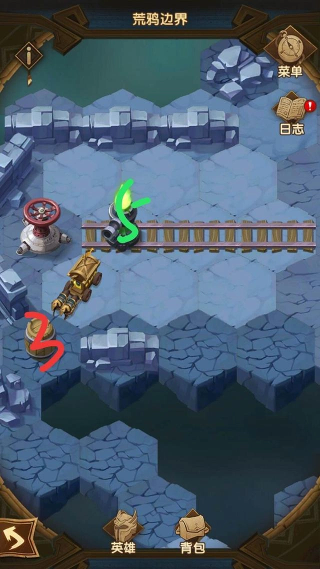 2号到3号的原理也是一样的,先移除路轨上的路障,击发2号炮台,这样3号炮台就会被引燃。接着击发3号炮台,就能炸掉1号火药桶。而3号引燃4号的话,就得利用传送门了,就像下图展示的那样,把阵型微调成这个样子后直接击发就行——点击击发3号炮台,4号炮台就会被引燃。