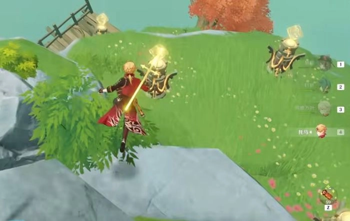 当布丁岛出现变化时,大家可以直接前往小岛顶部,接着朝东北方向行进——此时你们会来到悬崖边缘,直接跳下后能看到半腰处的机关:雷标仪和五根雷元素柱子,柱子旁还有一个雷元素球。触碰这个雷球后,它会在周围盘旋,大家要留意它盘旋的位置顺序,这正是解开雷元素柱的关键;解开后雷球便会静止,此时触碰雷球让自身附着雷元素,再跑到雷标仪旁引导指针到特定位置,就能开启一个小宝箱。另外,岛的周围还有一只小仙灵,跟着它走会到达盆景附近,盆景周围有三根石柱,意味着玩家需要找到三只小仙灵才能完成解锁。
