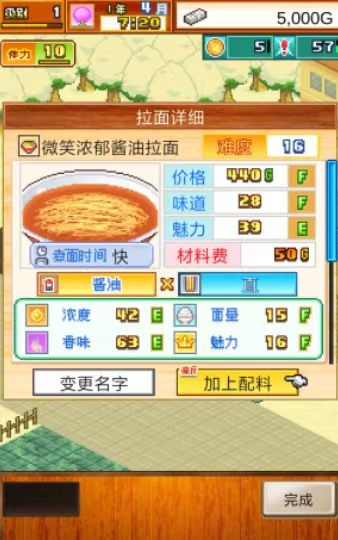 大家在做好一碗拉面后,点击刚完成的拉面,就能查看这碗拉面的具体属性和对应数值,比如面量、香味等。多数数值都是越大越好,但也有例外:面量要让客人吃得刚好,不能过多或过少;香味则是越大越好,香味越浓吸引的顾客越多,排队的客人也更有耐心;拉面的材料费尽量越低越好,毕竟成本高利润就少,但这不是说要偷工减料,而是在保证质量的前提下尽量降低成本;味道肯定也是越大越好,这直接关系到店铺评分;建议大家定价前先看看顾客情报,别超过他们带的钱。