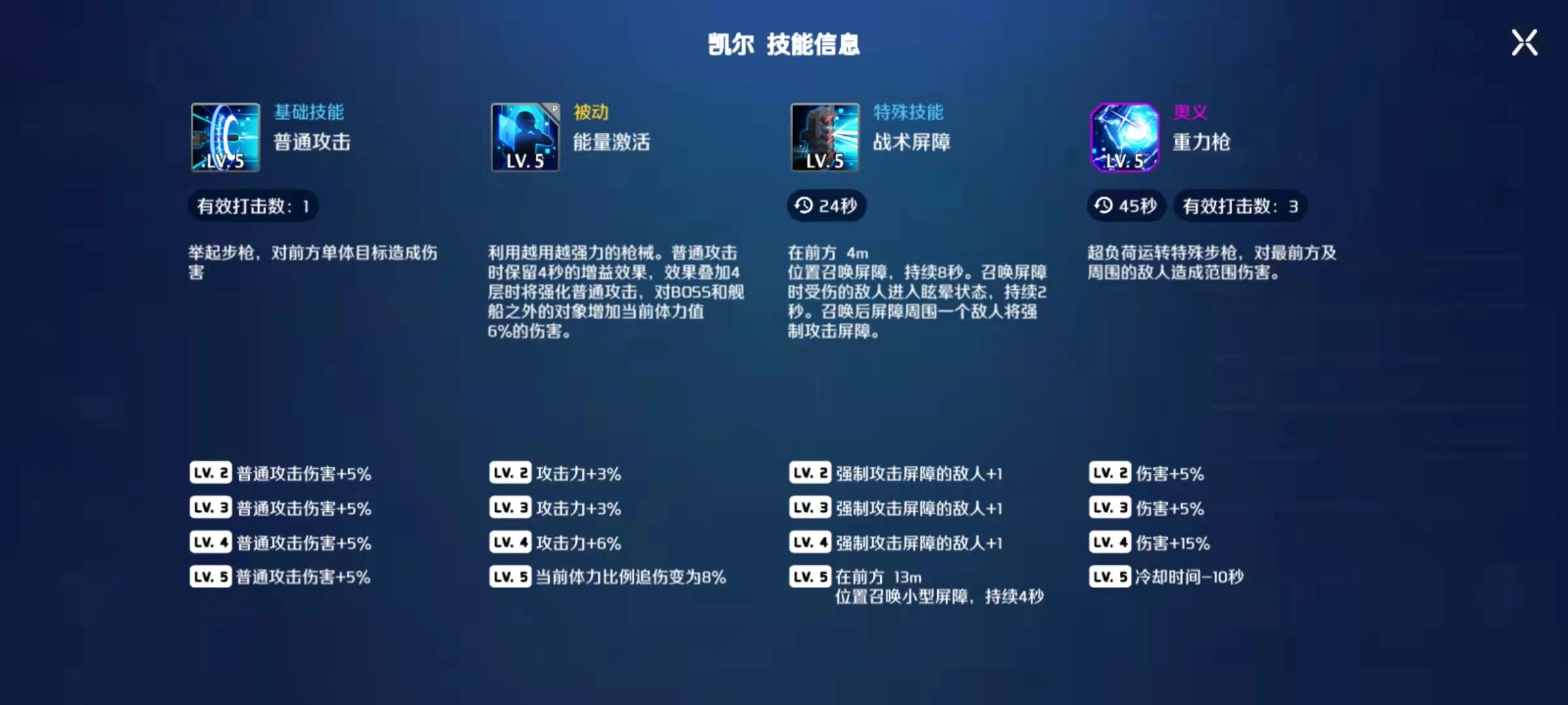 奥义技能为重力枪,能运用专属的特殊步枪,对敌方阵前最靠前的敌人造成高额范围伤害。尽管冷却时间相对较长,但其效果十分出色。从凯尔的技能特点不难看出,他虽不具备全直接攻击型的技能,但整体对战斗的影响依然良好,属于团队型角色。