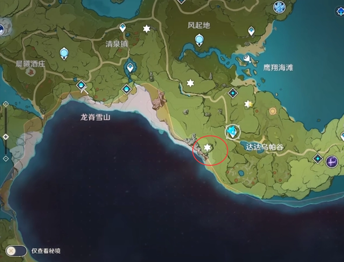 第五个位置就在我们刚传送的秘境旁边,传送到南风之狮后,转身往背后的悬崖上方走。