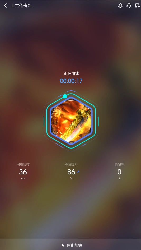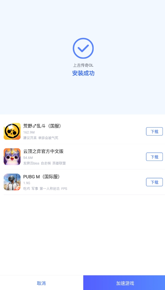 上古传奇OL完成下载与安装后,会弹出对应的窗口,若想马上开启游戏,点击右下方的“加速游戏”按钮就能直接启动。之后使用的时候,可直接在应用的“加速”板块里找到上古传奇OL再打开。