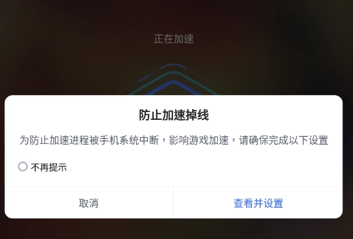 玩家首次进入加速界面时,会收到系统发出的提示。该提示旨在引导玩家对手机进行设置,避免加速进程被系统中断。玩家只需点击“查看并设置”,并按照教程步骤依次完成相关配置,就能有效防止加速掉线,确保加速过程顺畅。