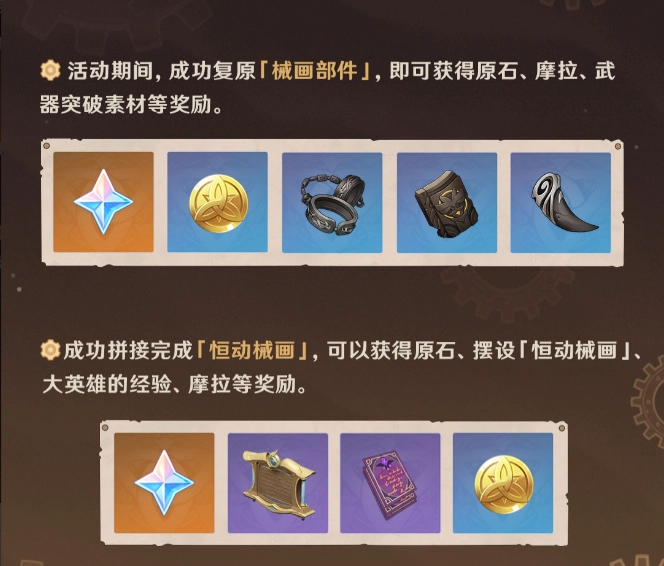 要是复原过程不太顺利,不妨过段时间再去查看械画的结构,这样能更方便自己判断方位。在活动进行期间,玩家只要成功复原械画部件,就能得到原石,摩拉和武器突破素材也都包含在奖励里。而当玩家成功拼接完成恒动械画后,还可以获得摆设恒动械画以及大英雄的经验等奖励。