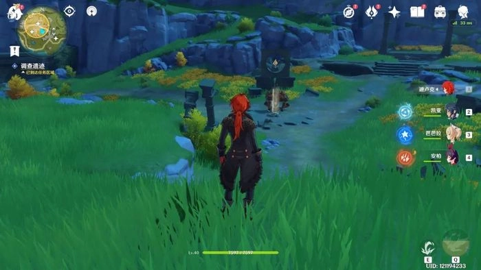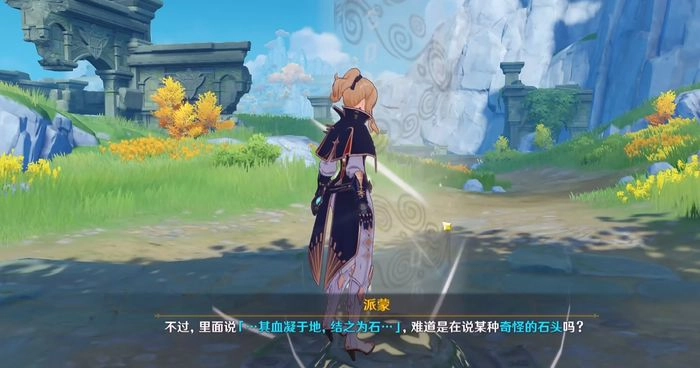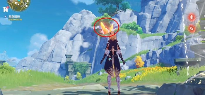 看到上方标记区域里那块黄色的大石头了吗?它附近就有我们要找的雕像。大家站在这个圆柱旁边转动视角,就能把所有雕像都看到了,然后直接过去激活那个龙形雕像就行。最远的那个雕像那里,我们过去后会有丘丘人来攻击,记得先处理掉它们。之后打开宝箱领取奖励,再按照指示去村子里看看。