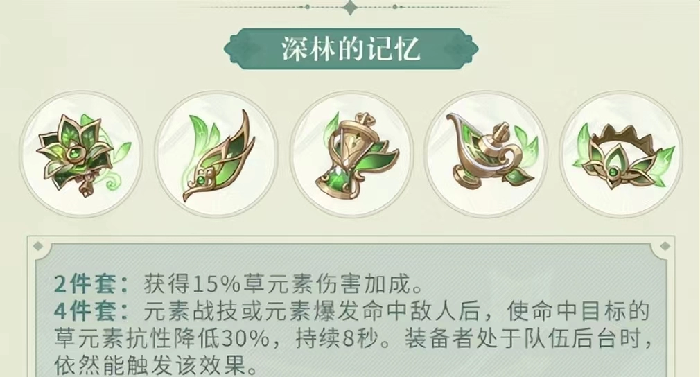 两套圣遗物分别是森林的记忆与饰金之梦,森林的记忆两件套效果为提升角色15%的草元素伤害,四件套则能让目标的草元素韧性降低30%;饰金之梦两件套可增加角色80点元素精通,四件套具有强化角色的效果。