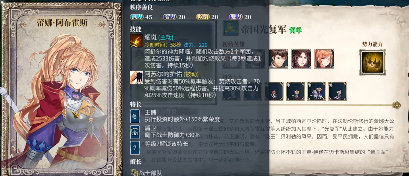 在确定好你想推进的剧情走向后,就可以挑选四位跟随自己的英雄了。这里有个挑选的关键,就是要关注这些英雄的特长与四维属性。对于第一次玩的新手而言,选那些四维属性比较均衡的英雄是最稳妥的做法。除了阵容适配度的考量外,英雄所具备的特长数量还影响着他们的成长潜力,这也决定了该英雄是否值得投入资源去培养。选好跟随的英雄后,玩家对跟随士兵的选择也不能马虎,你可以从六个兵种里自由组合出六个单位,甚至选完全相同的兵种也没问题。这里给大家一个建议:如果选了姐姐的阵容,那所有士兵都选战士会比较好,因为姐姐能给战士部队提供增益效果。确定好兵种后,玩家还可以选择势力能力,这个搭配的要求不算高,要是选了战士,多加点战士相关的天赋就行。难度选择方面,刚开始肯定选简单模式最合适,等玩到二周目、三周目时,再去挑战更高难度也不迟,而且首次通关也只能选简单难度(要是喜欢休闲玩法,那就选海格莫尼亚)。