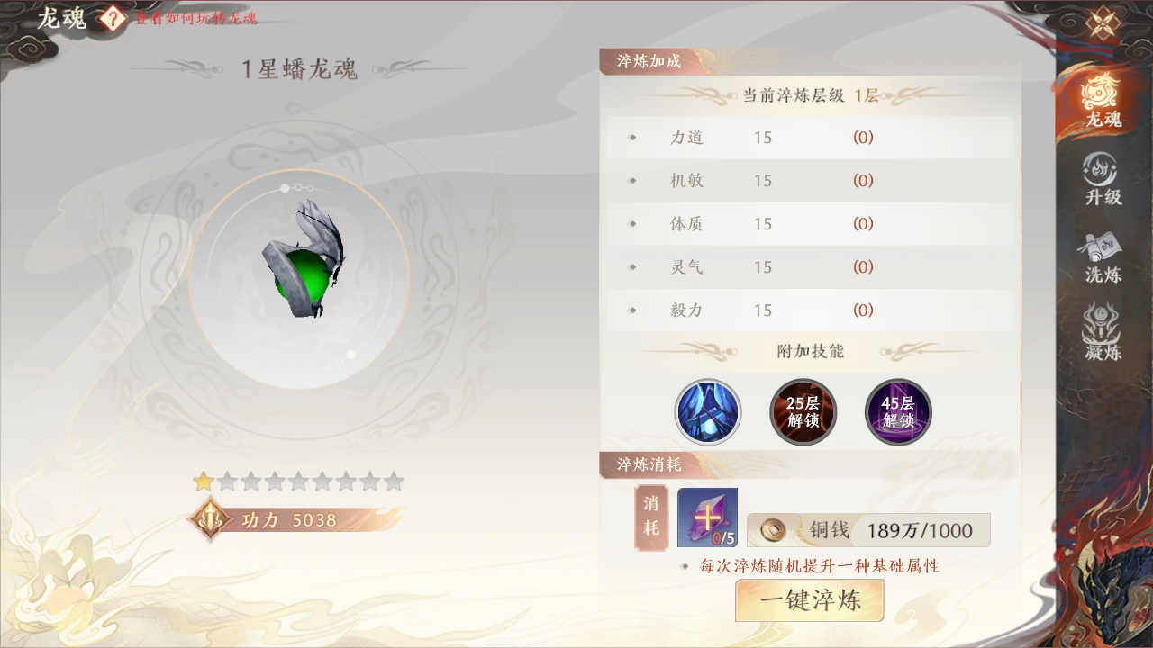这个板块得等角色等级到37级才能解锁,解锁之后就能从功能栏里打开它。要是之前还没拿到龙魂,建议先去做对应的支线任务:首先找那个看起来像将军的NPC,他会给你一个一星的蟠龙魂;接着再去找主角的师姐,触发第二个支线任务的剧情,完成后她还会再给你一个蟠龙魂。目前蟠龙魂有三种玩法,分别是“升级”“洗练”和“凝炼”。