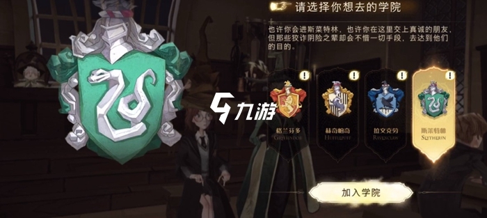 蛇学院斯莱特林的院长是霍拉斯·斯拉格霍恩,该学院推崇的品格为能力与野心,代表人物包括萨拉查·斯莱特林和西弗勒斯·斯内普。当我们选定最后一个选项斯莱特林学院,并点击下方的“加入学院”按钮后,就能顺利完成学院分配了。
