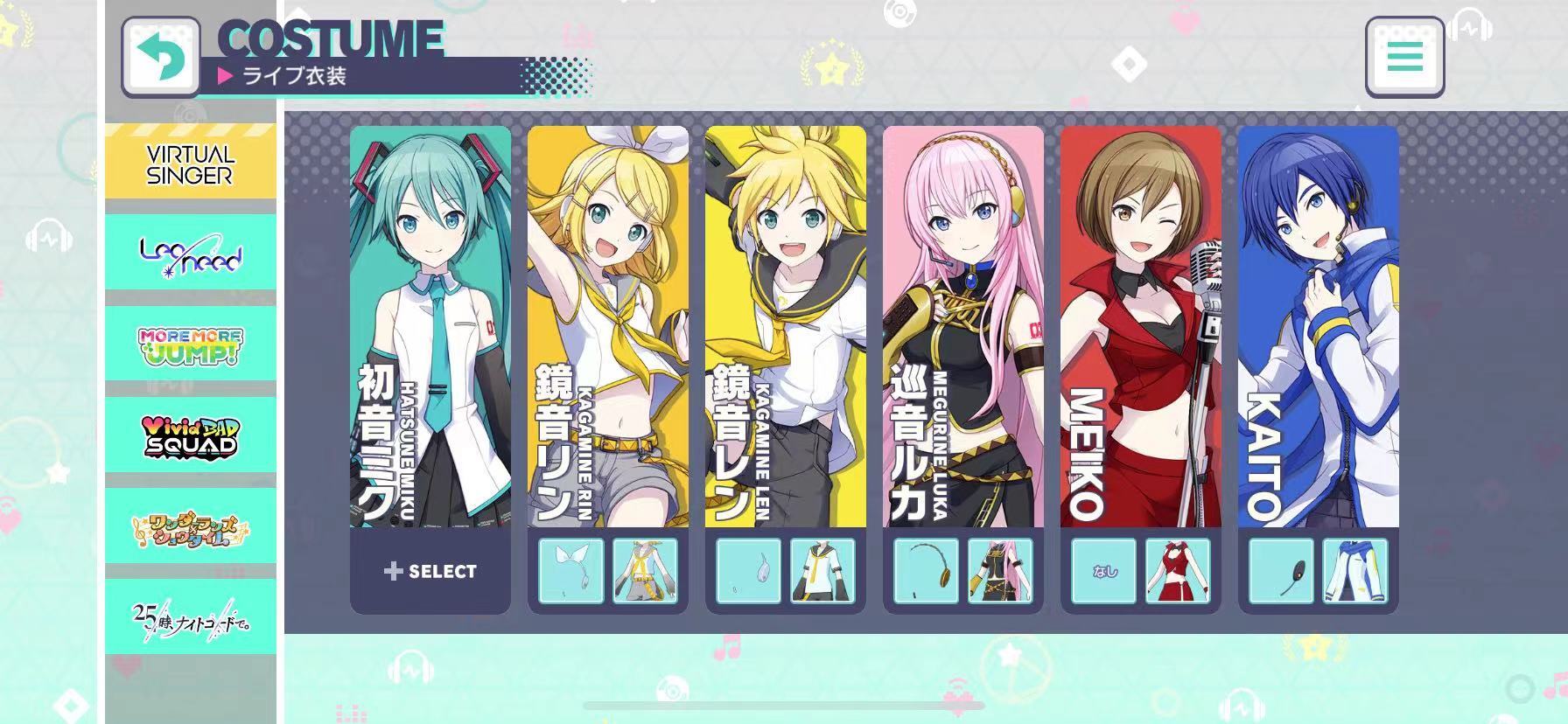第一类是虚拟歌手偶像,共有六位,他们分别是初音未来、镜音铃、镜音连、巡音流歌、鸣子和KAITO。