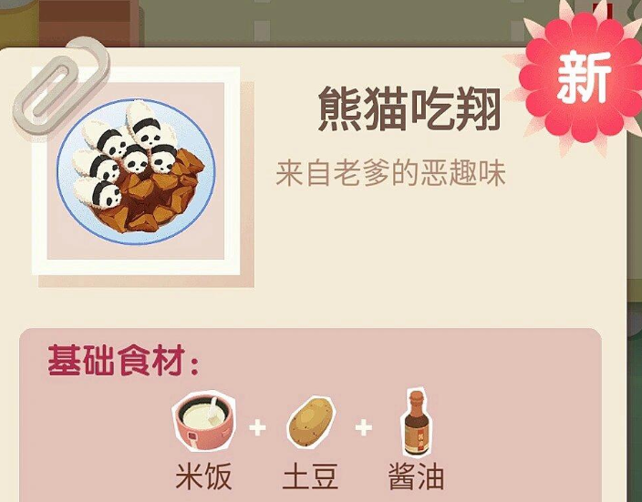 在老爹大排档里,会有一个特殊的触发条件——一只大熊猫突然登门,它想吃的是游戏里一个充满恶趣味的菜品,不少玩家都搞不清这个菜谱的具体构成,接下来我就给大家分享熊猫专属菜品的配方。