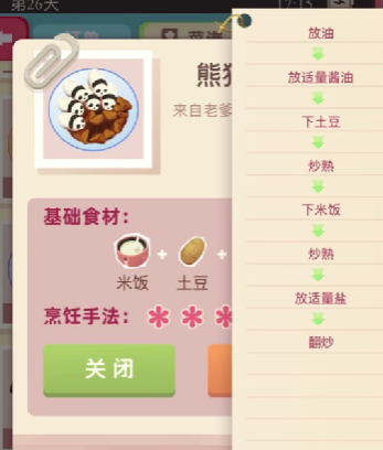 今天老爹大排档里熊猫相关的菜品介绍就到这里啦,不仅详细说明了熊猫的菜是什么,还分享了对应的菜谱和制作方法。在这款游戏里,玩家可以解锁各种各样的菜谱来制作美食,既能享受烹饪的乐趣,也能体验模拟经营带来的独特游戏感受,祝大家在游戏里玩得开心!