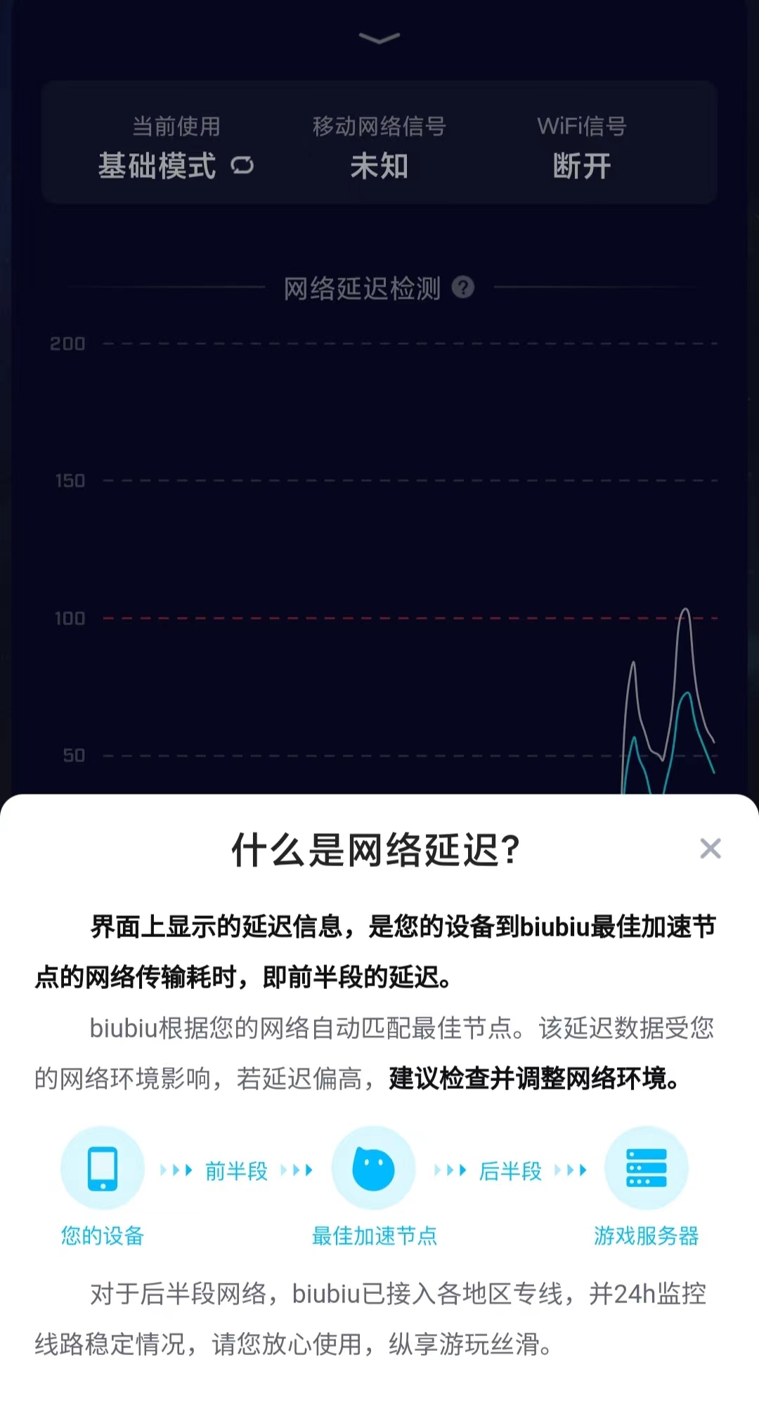 玩家完成搜索后,需点击加速按钮进入加速界面,该界面将呈现网络延迟的数据。