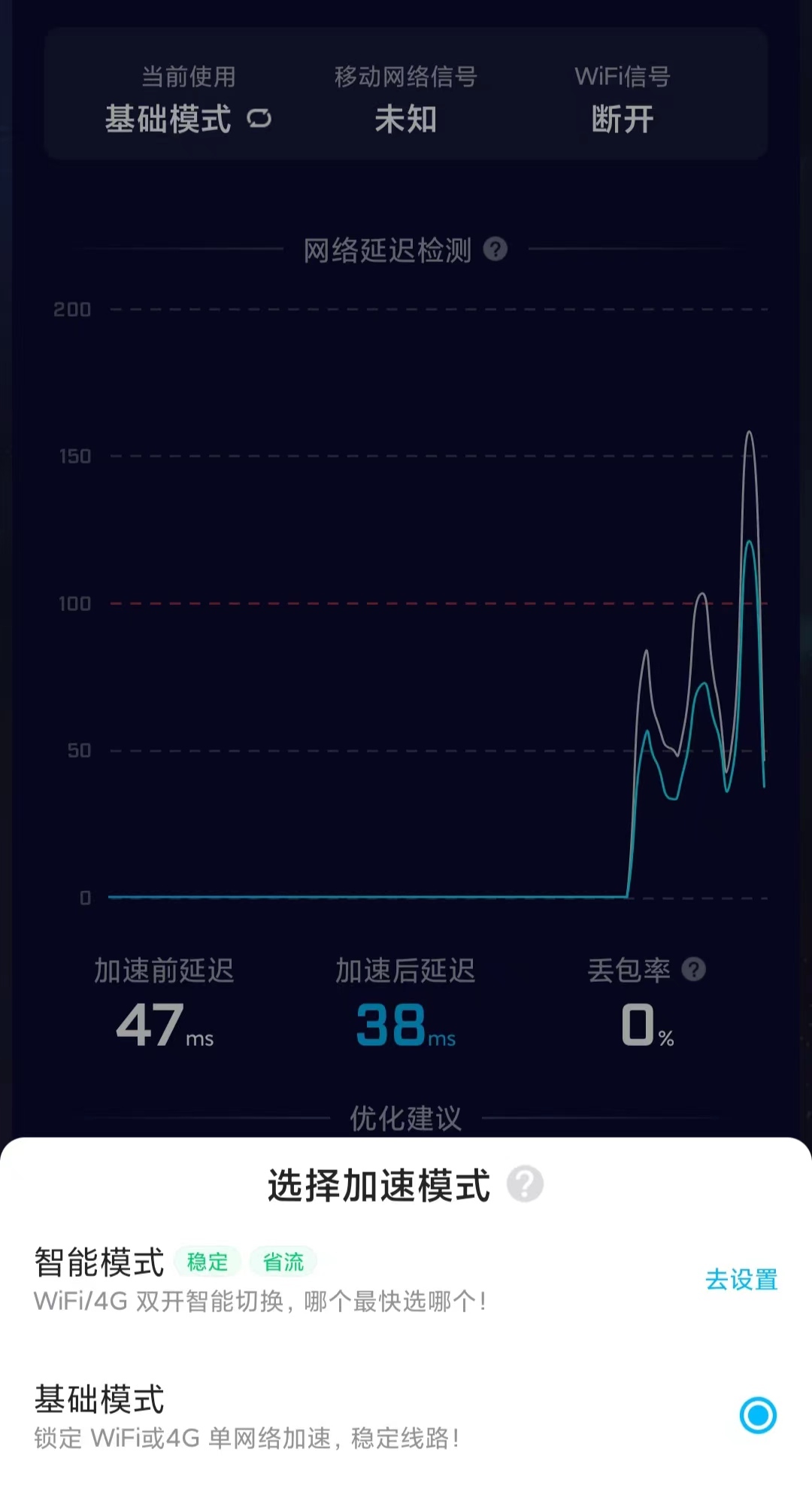要是感觉加速效果没达到心里预期,不妨试试更改加速模式。点击下方的模式按钮就能进入设置界面,再点一下去设置就能完成模式更换。更换成功后,界面上的“当前使用”一栏就会显示“智能模式”这四个字了。