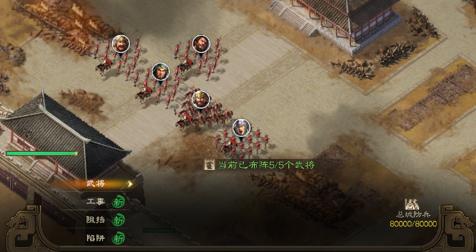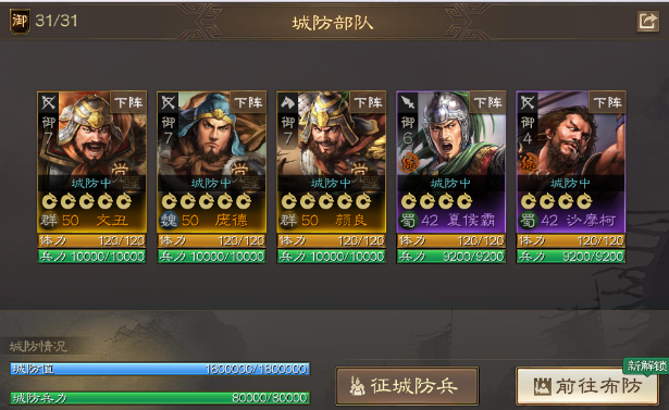 城防部队,顾名思义,就是承担城市防御任务的部队。和出战部队相同,它支持玩家同时安排五名不同的武将上阵,在自己的城市里开展防守工作。在防守过程中,除了基础防御工事或陷阱能为玩家提供战力输出方面的帮助外,其他的输出就得依靠玩家所配置的武将了。