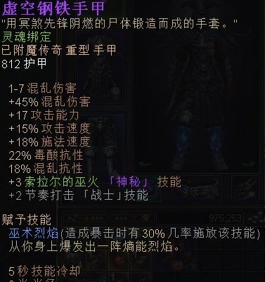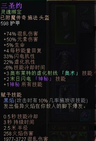 排除奥术意志后,常驻算入智力的混乱伤害加成达1800%,火焰伤害加成则为500%;若采用“先转化后加成”的方式,转化后的伤害加成幅度可提升至3.6倍。这套build的核心思路是转化火伤,其中大恶魔的火伤经转化后输出最为凶悍;其次是噬命魔印的进阶效果——可同时存在三个魔印,既能提供可观的秒伤,其范围吸血效果还能大幅提升生存能力;第三是卡里多风暴的火伤(该技能可享受高施法速度加成),虽单次伤害不突出,但积少成多后能堆出不错的总输出,且其特效多为AOE,配合站撸打法集中聚怪输出时,在竞技场中会更具优势。此外,护肩的“虚化转混乱”词缀,可将卡里多风暴与遗物阿格维斯的恶怨(需自带30+虚化抗性,若没有则换用奥祖因烈焰,转化后伤害更高)的部分虚化伤害转化为混乱伤害,从而进一步拔高输出上限。