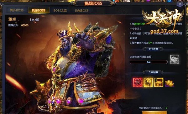 在37《大天神》中体验机缘BOSS玩法的玩家,每在线5分钟就有机会偶遇BOSS;每次偶遇后系统会额外刷新一个BOSS,成功挑战1次可积累1点进度,进度值满即可领取超级奖励;此外,每位玩家每天最多能保留5个待挑战的机缘BOSS。