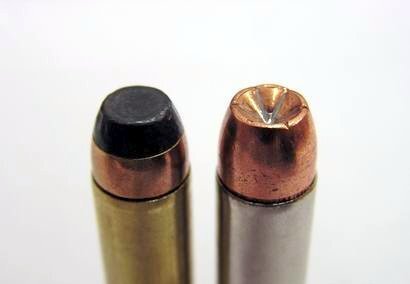 下图中,左侧为JSP弹药,右侧为JHP弹药。理论上来讲JSP弹药并不是以穿透力见长,而是以空腔效应见长的。所以,如果要体现穿透力大于扩张力,应该选用的是FMJ才对。不过由于游戏中将这种弹药命名为Hard-Cast,所以在数据上这种弹药穿透力强并没有错。