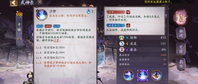 当海原贝戟处于场上时,千姬与海原贝戟将获得伤害减免效果;此外,友方单位每消耗1点鬼火,就能为海原贝戟叠加1层潮声。当潮声叠加至7层时,将立即回复3点鬼火,同时使全体友方的伤害获得永久提升。