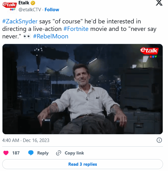 不仅如此,施奈德还曾公开表示,自己非常愿意执导一部《堡垒之夜》电影。