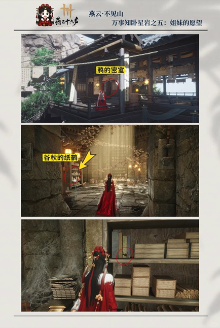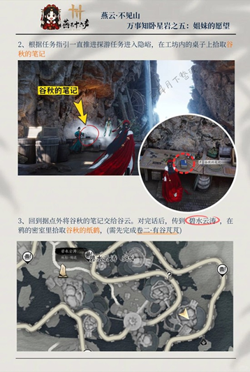 回到据点外,把谷秋的笔记交给谷云。对话结束后,传送到水云,去鸦的密室里拾取谷秋的纸鹤,(需要先完成卷二·有谷芃芃)
