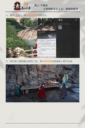 再次进入隐峪据点内的工坊,把谷秋的纸鹤放置在桌板上就能完成任务了。