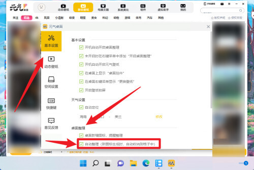 进入新界面后,点击左侧的“基本设置”选项,接着在右侧“桌面整理”板块中找到“自动整理”功能,将其对应的勾选框选中即可。