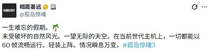 这项公告由《孤岛惊魂》官方社交媒体账号发布,文中还着重提及了游戏场景的设定情况以及技术层面的优化内容。育碧在推文里这样表述:“一生仅有一次的假期体验。未经修饰的自然景致。辽阔敞亮的天空。当游戏在现役主机上以60帧的速率运行时,所有画面都会更为顺滑流畅。带上轻便的装备出发吧,毕竟局势可能会毫无预兆地发生改变。”