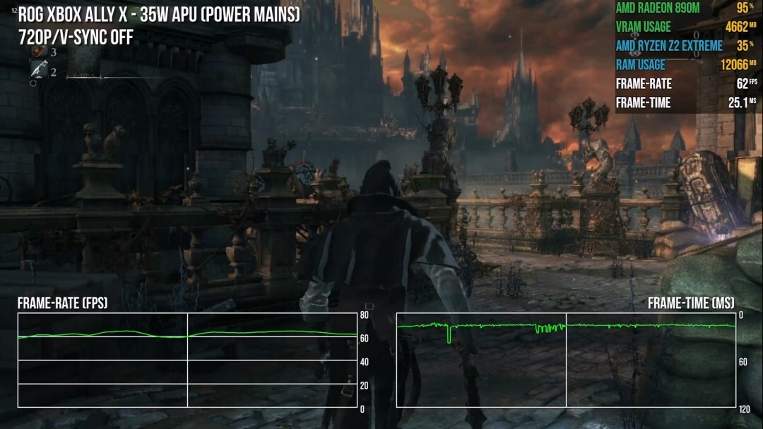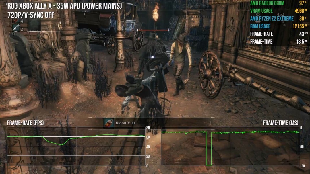 不过,《血源》在掌机上的游玩体验还称不上完美。一旦ROG Xbox Ally X的功耗降至35W以下,游戏就频繁出现画面卡顿与帧率下降的情况。