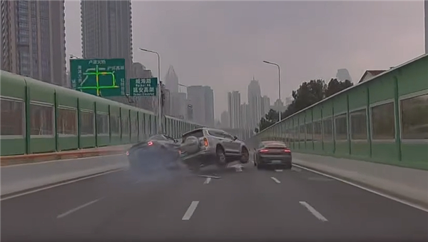 看到这一幕,Model 3的驾驶员立刻加速冲上前,使出了一招“美式截停”。坦克500因为重心较高,被撞击后瞬间就失去了平衡,径直撞上了右侧车道上另一辆正常行驶的车,随后便侧翻在地。