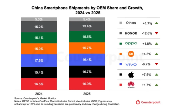 1月19日,调研机构Counterpoint Research发布了2025年第四季度以及2025年全年中国手机市场的出货量数据与排名情况。