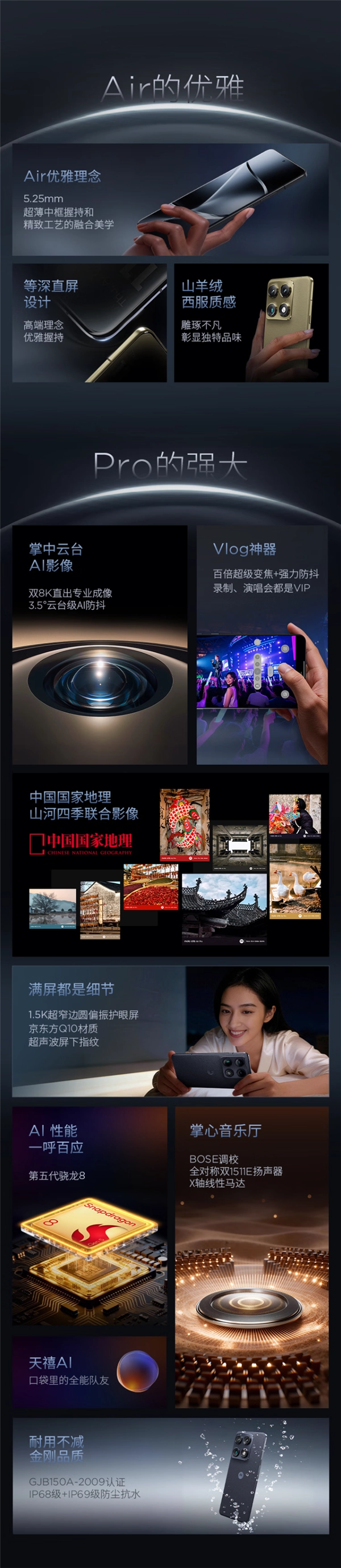 硬件配置方面,moto X70 Air Pro的后置摄像头采用了全5000万像素的旗舰三摄组合,具体包括5000万像素的索尼LYT-828超大底旗舰主摄、5000万像素的索尼LYT-600三倍潜望长焦镜头,以及5000万像素的三星JNS超广角微距镜头。同时,它配备了业界领先的内置AI云台,支持3.5°云台级AI防抖技术,能够让用户轻松拍出高质量的大片效果。