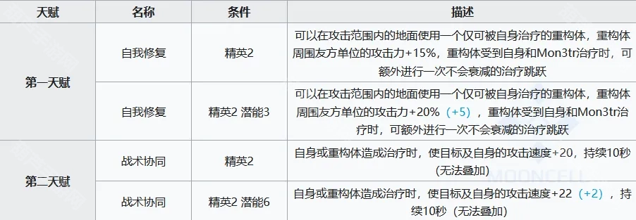 天赋2能无代价地为自身及多名队友(一般是最后部署的另外两名队友)提供+22(+2)的攻速加成;其二技能开启期间,攻速加成更是达到了61.6(+5.6)的惊人数值,效果比榴莲针的+50攻速还要强劲。该天赋效果虽无法叠加,但并未限制与其他攻速加成手段共同生效,也就是说M3和榴莲针的攻速增益可以同时作用。