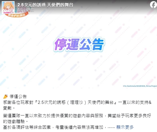 制作人的信公开之际,《2.5次元的诱惑天使们的舞台》海外版也发布了停运通知。官方称,尽管这是个艰难的决定,但未来日本版会承载着海外版的分量,继续全力丰富游戏服务内容。