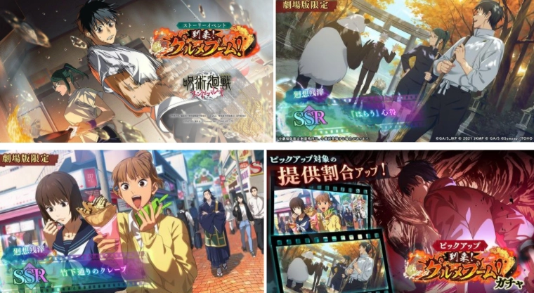 此外,游戏中还新增了SSR回想残渣「竹下通的可丽饼(暂译,竹下通りのクレープ)」「祓除的要领(暂译,はらう心得)」,以及故事活动「美食热潮来袭!(暂译,到来!グルメブーム!)」、迷你游戏「咒术回战~特级拉面道~(暂译,呪麺廻戦~特级ラーメン道~)」等内容。
