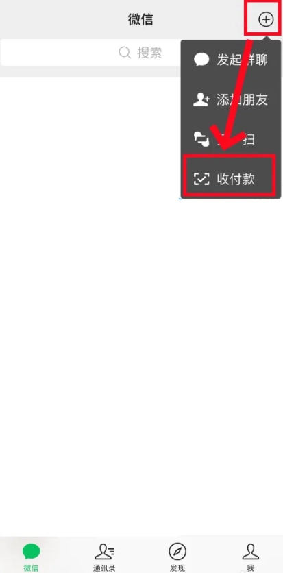 1、第一步是打开微信,找到右上角的+号按钮并点击,随后进入收付款页面