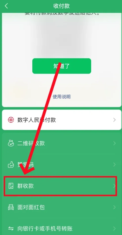 2、向下滑动页面,找到群收款功能