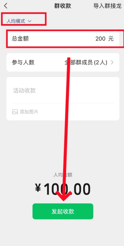 设置完成后,下方会显示出人均需支付的金额,确认金额无误后,点击发起收款按钮就可以了。